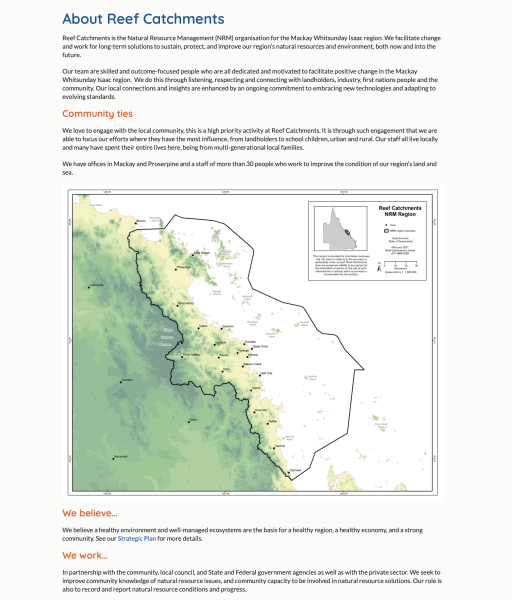 Reef Catchments is the Natural Resource Management (NRM) organisation for the Mackay Whitsunday Isaac region. We facilitate change and work for long-term solutions to sustain, protect, and improve our region’s natural resources and environment.