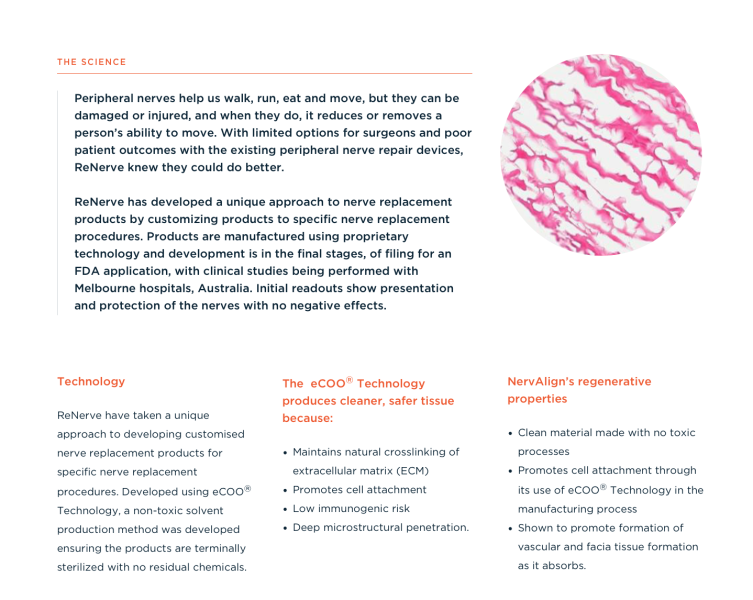 Products to Repair and Regenerate Damaged Nerves. ReNerve is pioneering the way in developing ready-to-use products for the repair or replacement of damaged peripheral nerves.